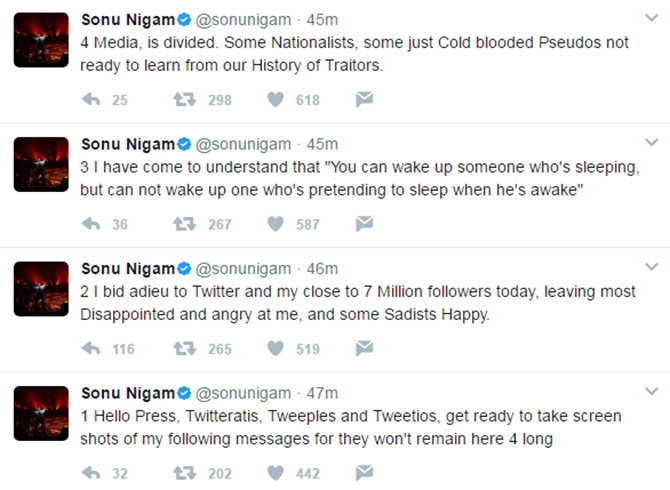 सोनु निगमले बुधवार लगातार २४ वटा ट्विट गर्दै ट्विटर छोड्ने कुरा गरेका थिए । सोनुले भने, ‘म ट्विटरको विरुद्धमा छैन । एकतर्फी लाजबाट दिक्क भएर ट्विटर छोड्दैछु । यस्तो ठाउँ रहिरहँदैन, जसले बिष फैलाइरहेको छ । मलाई मुस्लिम विरोधी भन्न थालिएको छ ।’